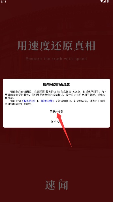 1、打开应用后仔细阅读服务协议和隐私政策,确认后点击同意并接受按钮进入。
