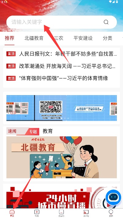 3、进入应用首页可浏览推荐热点新闻内容或通过搜索功能查找特定资讯信息。