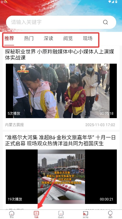 4、切换至视频专区可选择热门推荐、深度解读及阅览等分类观看新闻视频内容。