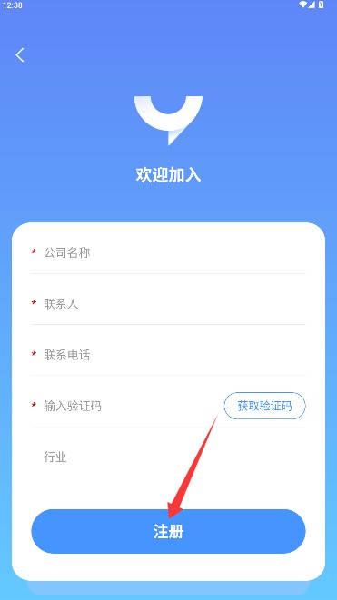 3、根据提示依次填写公司名称、联系人姓名、联系电话、验证码及所属行业完成注册。