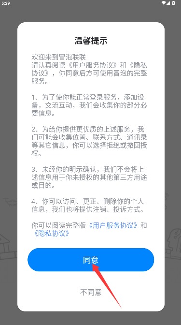 1、打开应用后仔细阅读用户协议和隐私政策,确认后点击同意按钮进入应用。
