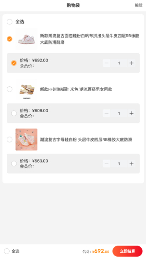 4、通过购物车页面统一管理所选商品,支持批量结算与删除等操作功能。