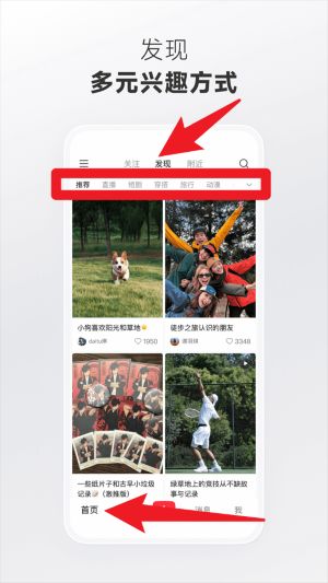 1、打开首页,点击“发现”页签可浏览多元内容,红框内标签可切换推荐、图集、短剧等类别。