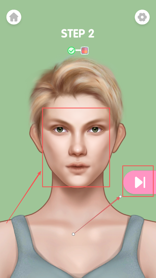 2、完成鼻子轮廓描绘后需要点击界面上的红色箭头进入下一步操作,这个过渡环节让玩家有机会检查当前完成情况,为后续化妆步骤做好准备。