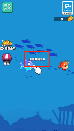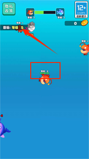1、通过手指滑动屏幕引导小鱼游动,在海洋场景中寻找可吞噬的小型生物或同等级目标,逐步积累进化能量。