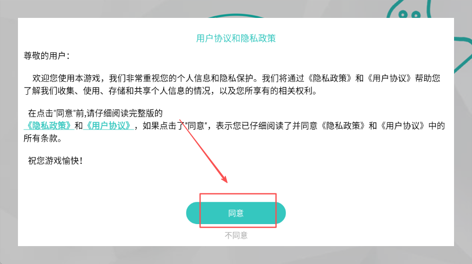 1、首先进入游戏界面仔细阅读用户协议和隐私政策内容,点击同意按钮确认并继续下一步操作,为后续的游戏体验做好充分准备和了解相关规则要求。