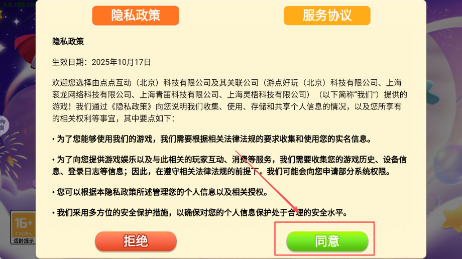 1、初次启动游戏时需要认真阅读隐私政策和服务协议的相关内容,确认无误后点击同意并继续按钮,这是开始游戏冒险之旅的第一步。