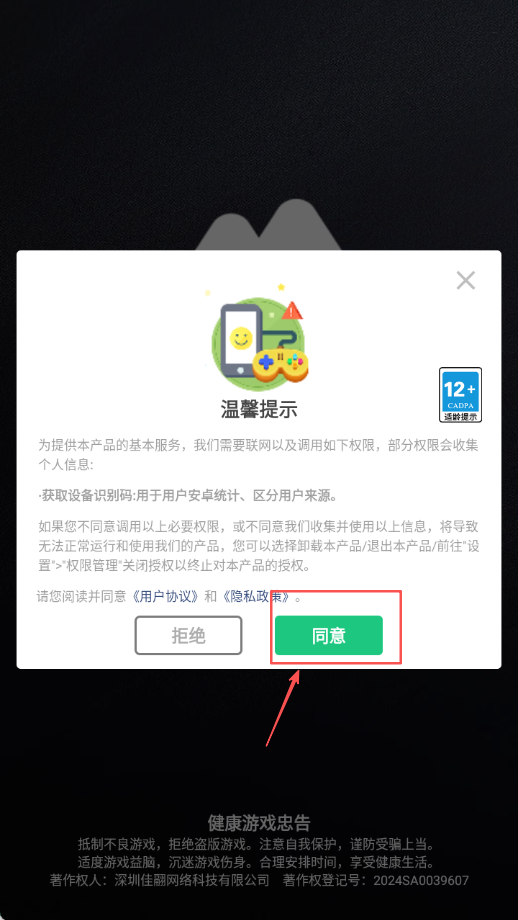 1、初次启动游戏时会显示温馨的提示页面,需要仔细阅读相关内容后点击同意按钮,这是开启童话之旅的必要步骤,建议在家长指导下完成此项操作。