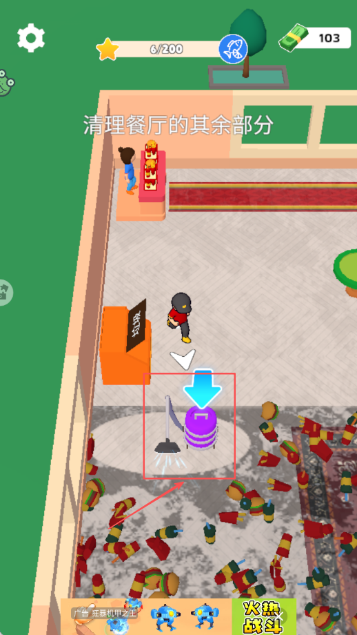 2、仔细查看地图上前方出现的红色标记区域,控制角色前往该地点,使用清洁工具将散落的垃圾彻底清理干净,维护小镇的环境卫生和整体美观度。