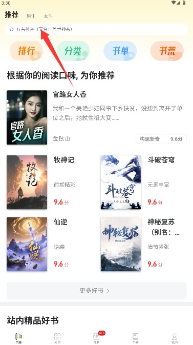 3、进入书城页面可浏览各类推荐书目,或通过搜索功能查找特定题材的文学作品。