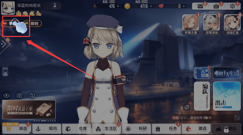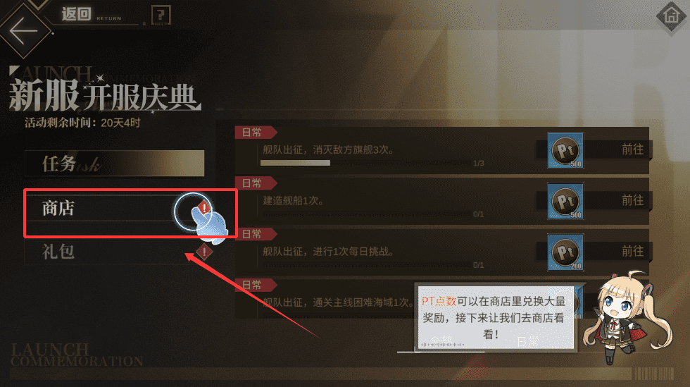 4、同时多出击提升舰队等级,这样既能推进主线,又能快速成长,享受开服庆典的各种福利啦。