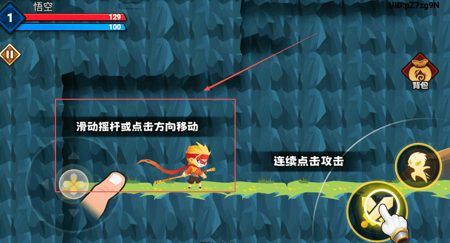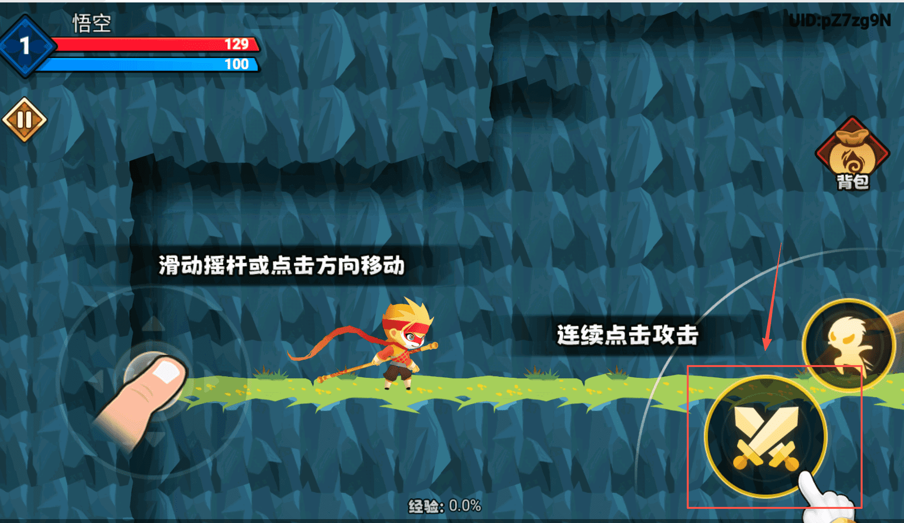 1、首先呢,进入游戏你会看到角色“悟空”和生命值、经验条等信息。