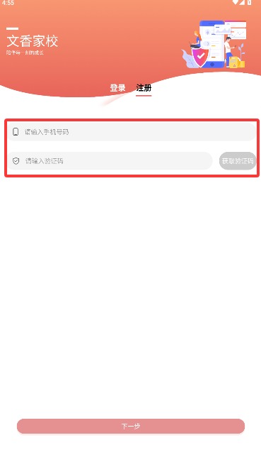 2、在注册页面输入个人手机号码及接收到的短信验证码,核对后点击下一步继续操作。