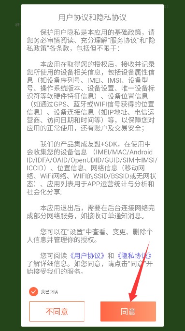 1、打开应用后仔细阅读用户协议和隐私政策,确认后点击同意按钮进入应用。