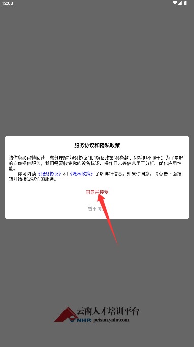 1、打开应用后仔细阅读服务协议和隐私政策,确认后点击同意并接受按钮进入。