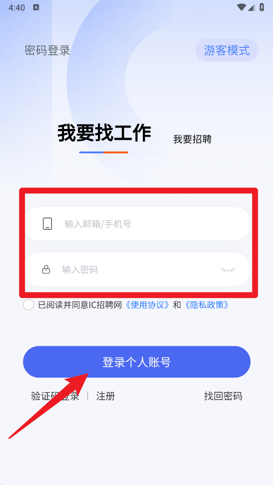 2、在登录界面输入邮箱或手机号与密码,点击【登录个人账号】,即可进入平台,也可选择注册或验证码登录。