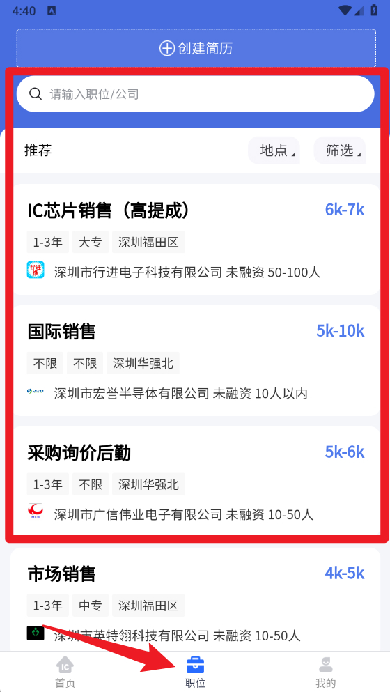 4、在【职位】页面中,可以通过搜索栏或筛选条件查找目标岗位,查看职位列表并挑选合适的机会。