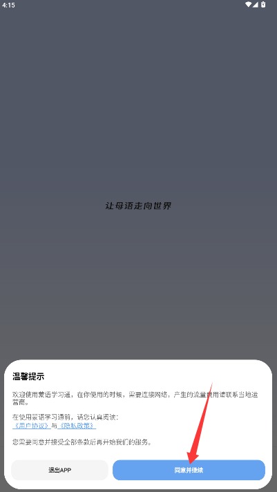 1、打开应用后仔细阅读用户协议和隐私政策,确认后点击同意并继续按钮进入应用。