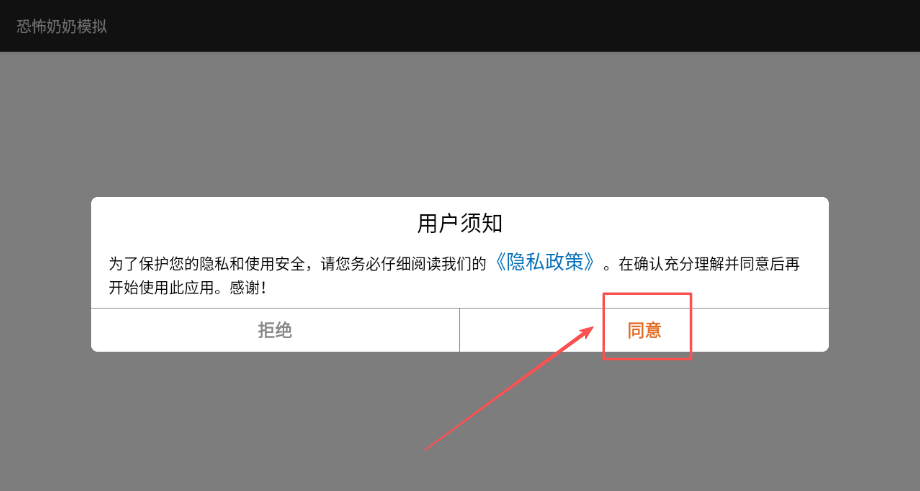 1、进入游戏后首先需要仔细阅读用户协议和隐私政策的具体内容条款,点击同意并进入按钮开始游戏体验逃脱挑战。