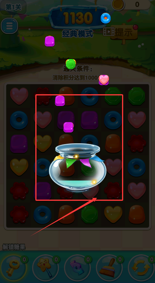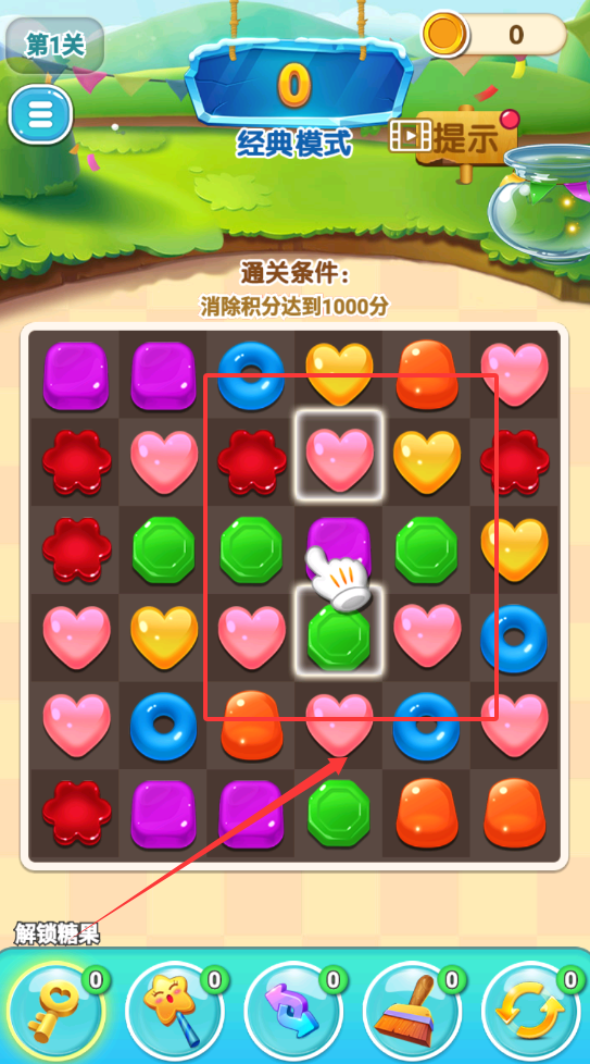 2、例如需要消除特定颜色糖果或是达到指定分数目标,然后通过手指滑动操作交换相邻糖果位置。