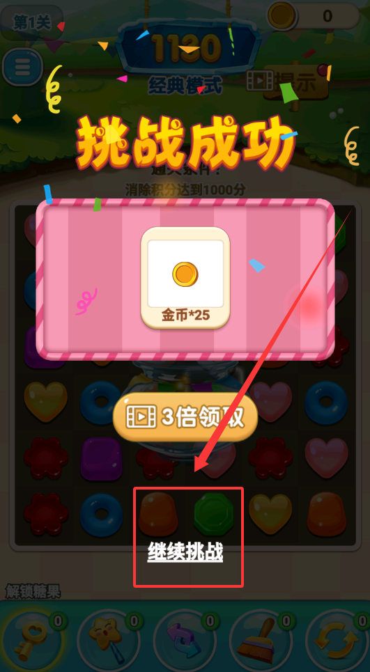 1、基础操作通过横向滑动改变同行糖果位置,或纵向滑动调整同列糖果顺序,当三个及以上同色糖果相邻时自动消除获得分数,连续操作时。
