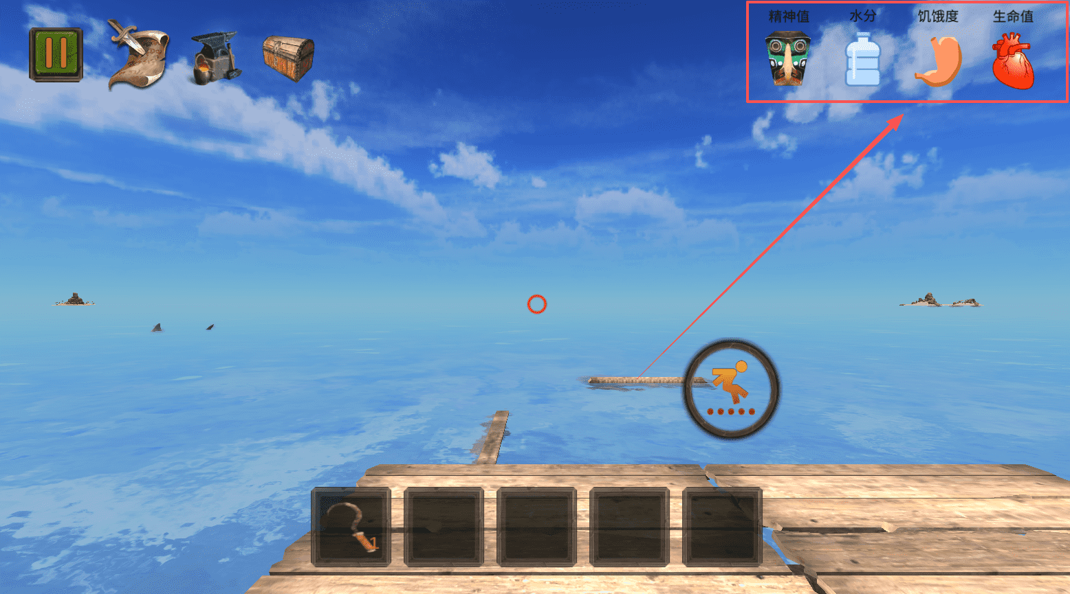 3、生存机制真实还原健康值与饥饿度双重指标,需要玩家平衡管理,同时还要兼顾木筏维护与扩建工作,极具策略深度和操作挑战性。