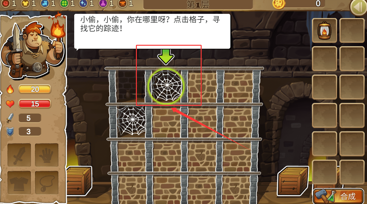1、核心目标是追踪偷鸡贼夺回火鸡,通过连续点击探索暗黑区域扩大可视范围,收集钥匙装备与合成素材,同时注意维持生命值。