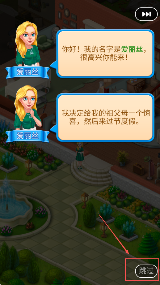 2、点击跳过按钮快速略过开场动画,直接进入游戏内容,节省不必要的时间消耗,快速熟悉核心玩法机制,为后续别墅建造做好准备。