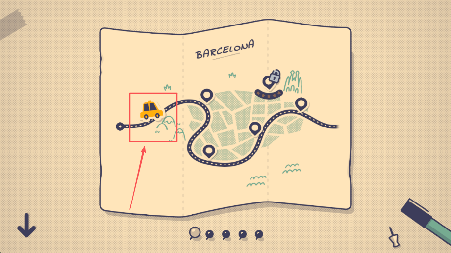 2、从巴塞罗那地图选择汽车图标,开始规划路线,观察地图上的各个地点分布,分析路线规划的可能性,考虑角色行程安排,制定最优出行方案。