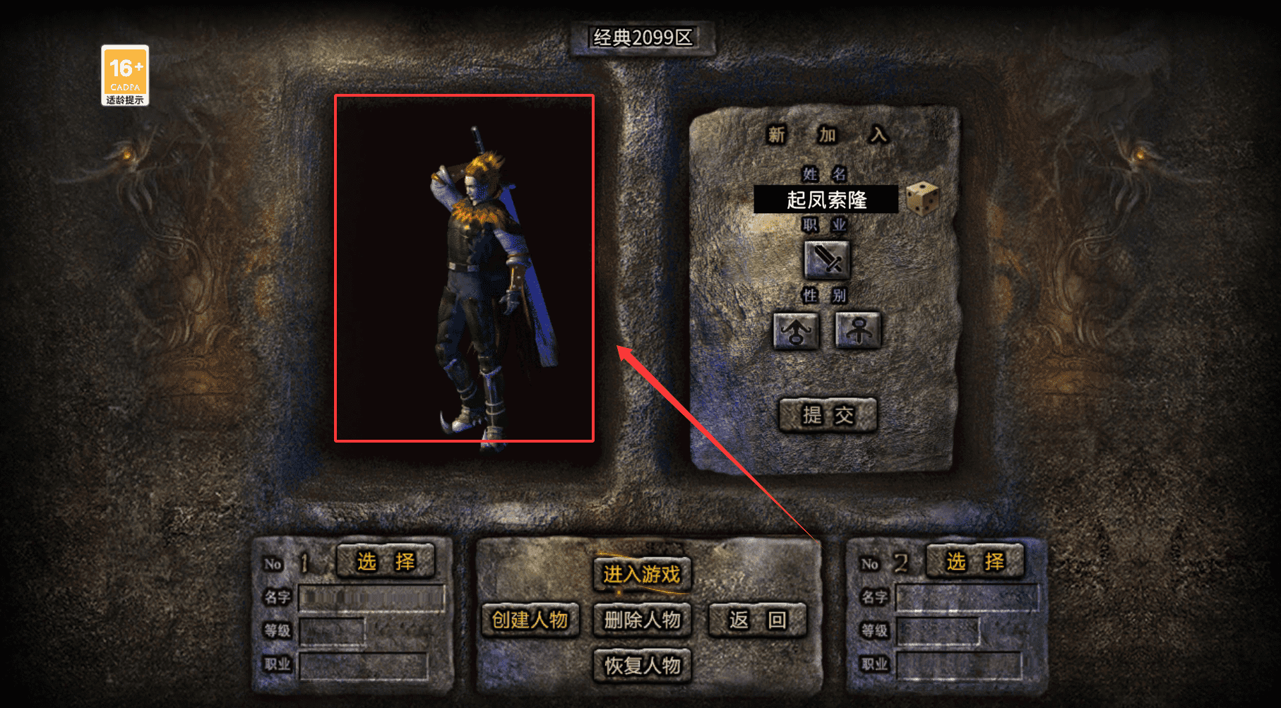1、先打开游戏界面,你会看到经典2099区和几个选项,包括进入游戏、创建人物等。