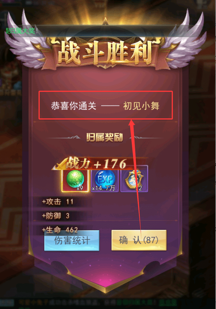2、查看伤害统计后点击确认按钮,就能领取奖励,这样你的角色会变得更厉害,为下一关做准备。