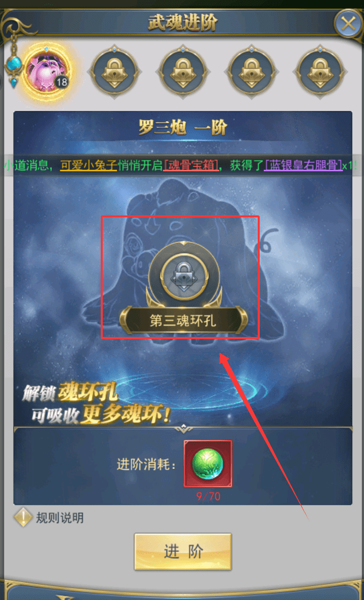 4、武魂进阶也很重要,在武魂进阶界面,像罗三炮一阶,你可以消耗材料解锁魂环孔。